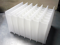 プラスチックダンボール(プラダン)製パーテーションプラスチックダンボール(プラダン)を使用した商品陳列台です。 上部の商品を乗せる台と、それを支える部分は取り外し可能。下の部分は折りたたんで収納することができます。
