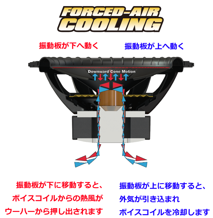 ■FORCED-AIR COOLING™を採用し、ボイスコイルの空冷効果を高め、長時間駆動をさせても最高のパフォーマンスを発揮します。